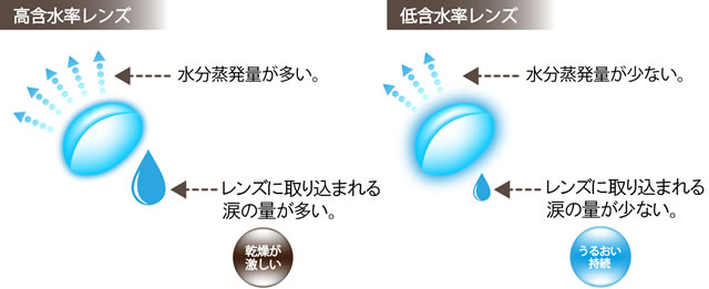 つまり、もともとの水分が多いレンズは、蒸発した水分を補うための水分(涙液)が多く必要なのです。